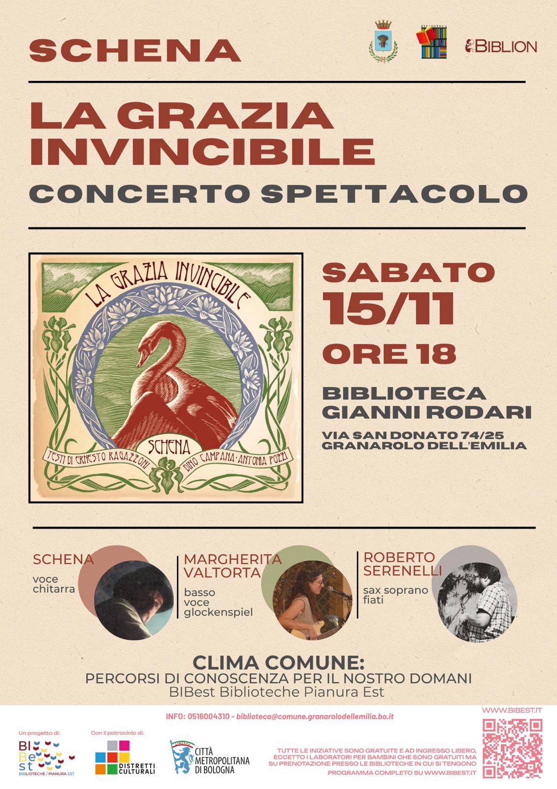 LA GRAZIA INVINCIBILE “DI SCHENA: I PROSSIMI APPUNTAMENTI LIVE A GRANAROLO DELL’EMILIA E BOLOGNA Due nuovi appuntamenti live per il cantautore e chitarrista bolognese SCHENA, che propone il suo secondo disco solista,“La grazia ...